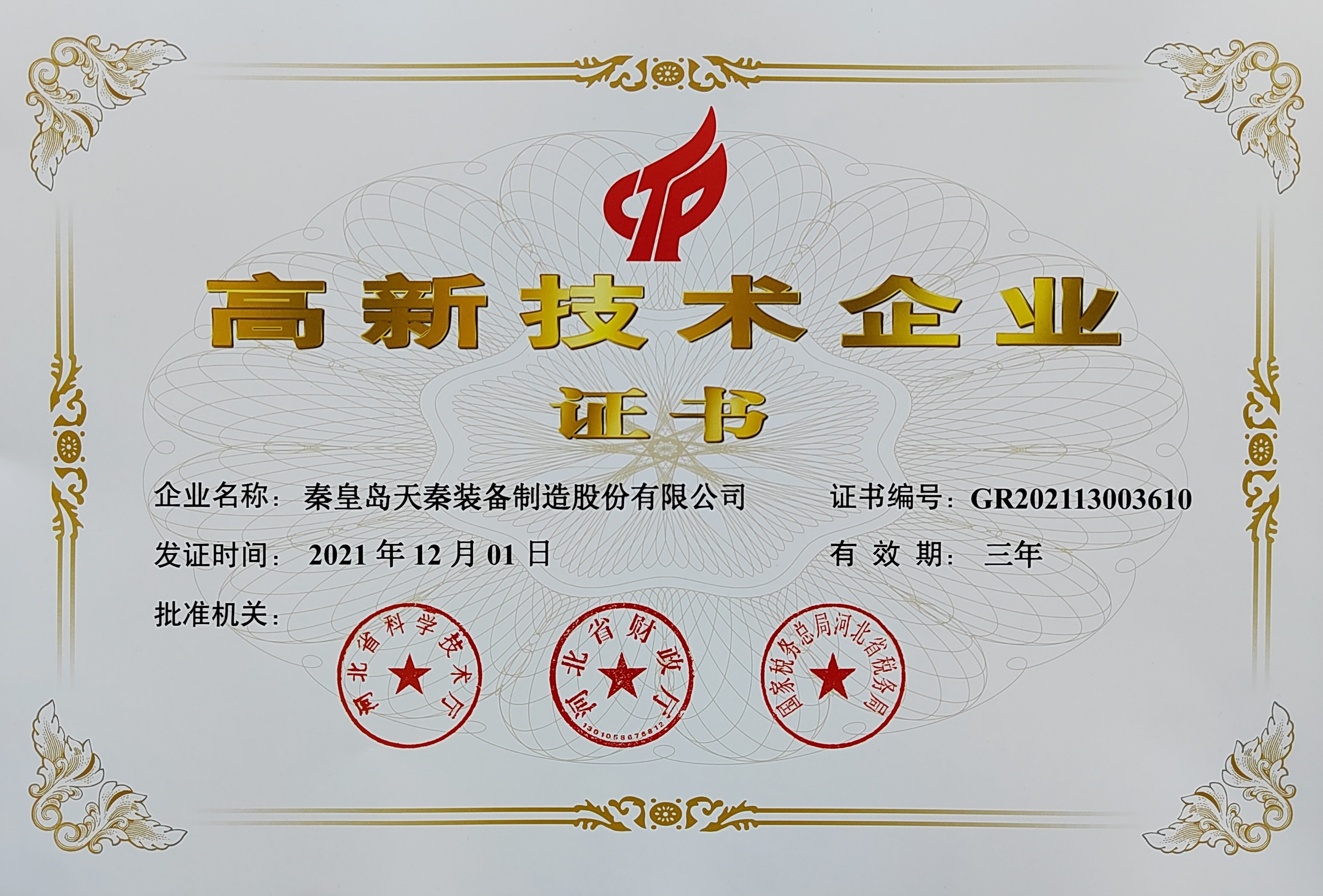 - 秦皇島天秦裝備制造股份有限公司創(chuàng)立于1996年,總部位于河北省秦皇島市經(jīng)濟技術(shù)開發(fā)區(qū),秦皇島廠區(qū)占地4萬平方米,擁有3萬平方米的標準廠房、辦公樓和工程技術(shù)研發(fā)中心;分部天津廠區(qū)位于天津市靜海經(jīng)濟開發(fā)區(qū),占地2萬平方米,擁有1.6萬平方米標準廠房。 公司通過了GB/T 19001質(zhì)量管理體系及GB/T 24001環(huán)境管理體系認證,是國家高新技術(shù)企業(yè)、河北省軍民融合產(chǎn)學(xué)研用創(chuàng)建基地,建有省級院士工作站。